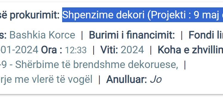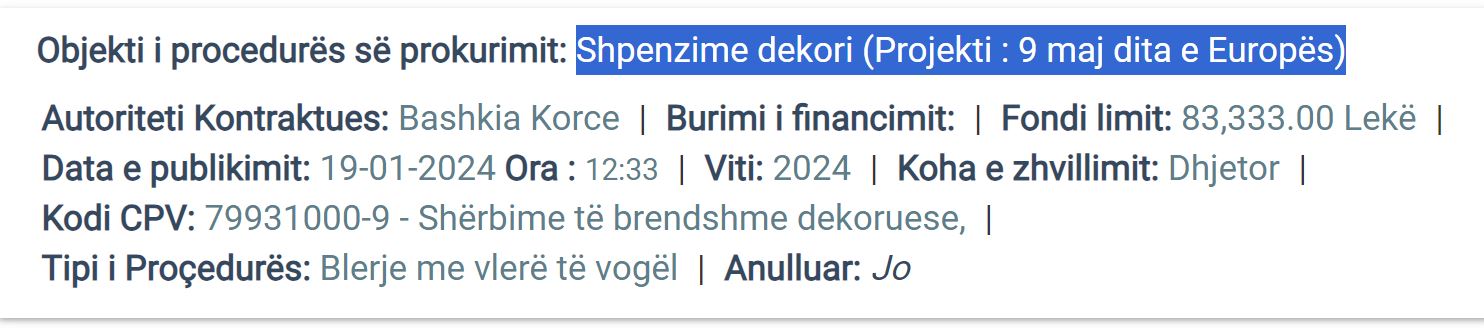 Tenderi i parë ka si objekt “Shpenzime dekori (Projekti : 9 maj dita e Europës)” dhe realisht është një tender i vogël me vlerë 830 mijë lekë. Por, nuk është edhe aq e vogël si vlerë po të merret parasysh se çfarë dekorimesh do të blejë Filo me këto para.