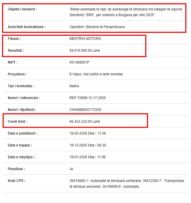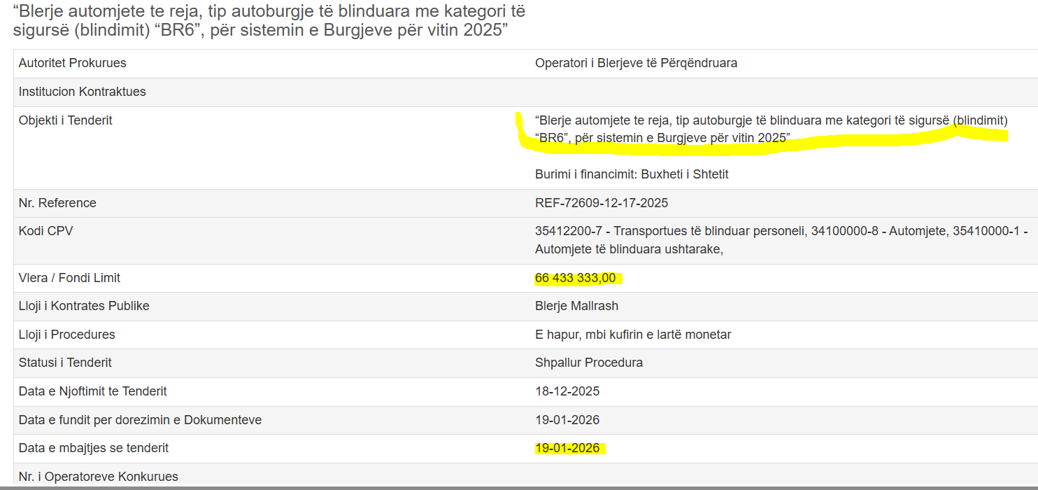 Operatori i Blerjeve të Përqendruara, nën drejtimin e Arlinda Pogajt, qe varet nga ministri Blendi Gonxhe, ka mbyllur procedurën për blerjen e “Autoburgjeve të blinduara BR6”. Fituesi? Kompania “MEKTRIN MOTORS”, në pronësi të Edmond Shahinit.
