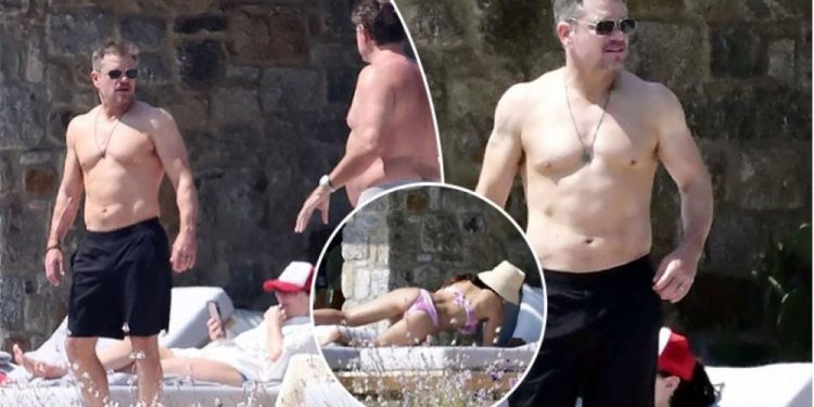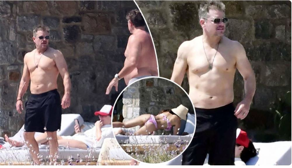 Matt Damon shfaqi trupin e tij me muskuj teksa doli pa këmishë, ndërsa rrinte në pishinë pranë gruas së tij të veshur me bikini Luciana Barroso në udhëtimin e tyre në Mykonos, Greqi me vëllezërit Chris dhe Liam Hemsworth.