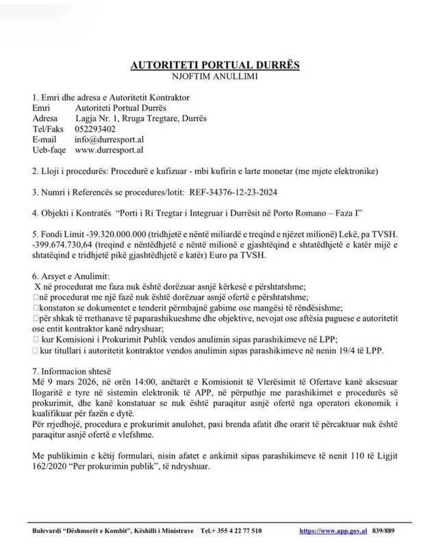 Është anuluar zyrtarisht tenderi për ndërtimin e portit të ri tregtar në Porto Romano, pasi kompania e vetme që kishte mbetur në garë, Archirodon Group, është tërhequr nga procesi.