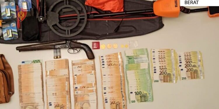 Policia e Beratit ka arrestuar një 31-vjeçar, ndërsa babai i tij është proceduar penalisht, pasi në banesën e tyre uniformat blu kanë sekuestruar 5 monedha ari, një pajisje metalkërkuese, 56.650 euro që dyshohet se kanë burim veprimtari të kundërligjshme, 1 armë gjahu dhe municione luftarake.