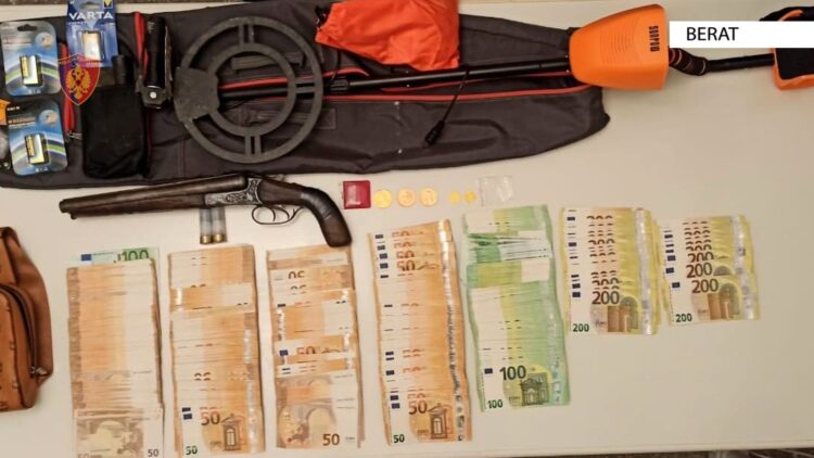Nga kontrollet, shërbimet e Policisë gjetën në banesën e 31-vjeçarit, 5 monedha ari, një pajisje metalkërkuese dhe 56 650 euro që dyshohet se rrjedhin nga veprimtari të kundërligjshme, ndërsa në banesën e 56-vjeçarit gjetën 1 armë gjahu dhe disa fishekë, që posedoheshin pa leje”, njofton policia.