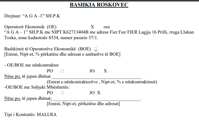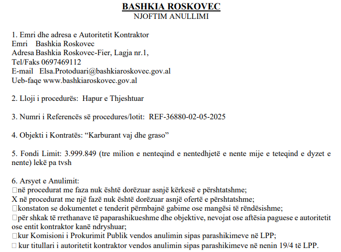 Bëhet fjalë për tenderin e Bashkisë Roskovec me objekt furnizimin me “Karburant, vaj dhe graso” me fond limit 3 999 629,00 lekë.