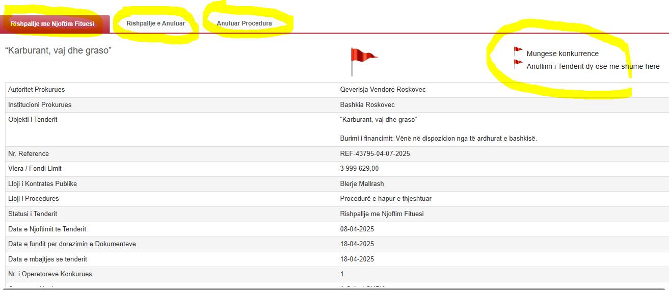 Për shkeljet e kryera, procedura e këtij tenderi ka marrë nga Open Data Albania dy “flamuj të kuq” që tregojnë risk të lartë korrupsioni: Njëri është për mungesë konkurrence, ndërsa tjetri është për anulim të tenderit më shumë se dy herë.