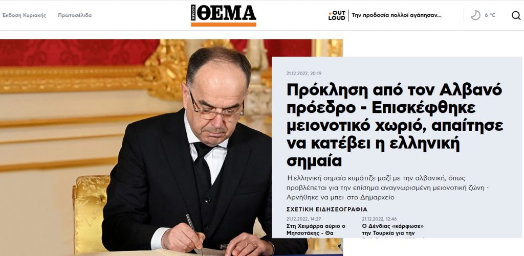 “Zyrtarë të minoritetit grek thonë se presidenti shqiptar duket se nuk e di se në bashkitë e EEM – bazuar në ligjin për minoritetet – flamuri grek duhet të valojë jashtë ndërtesave publike. Ata theksojnë se Bajram Begaj “duhet të sillet si faktor institucional unifikues dhe jo si një ish-ushtarak me logjikë nacionaliste” – citon gazeta.