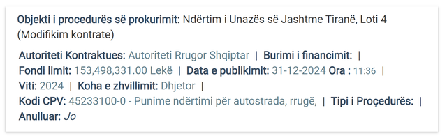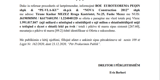 Në vitin 2021, ish-drejtori Evis Berberi firmosi fituesin e tenderit të lotit 4 të Unazës së Madhe të Tiranës. Sipas dokumenteve, fituesi i lotit 4 ishte një bashkim operatorësh “EUROTEOREMA PEQIN” & “PE-VLA-KU” dhe “NOVA Construction 2012”.