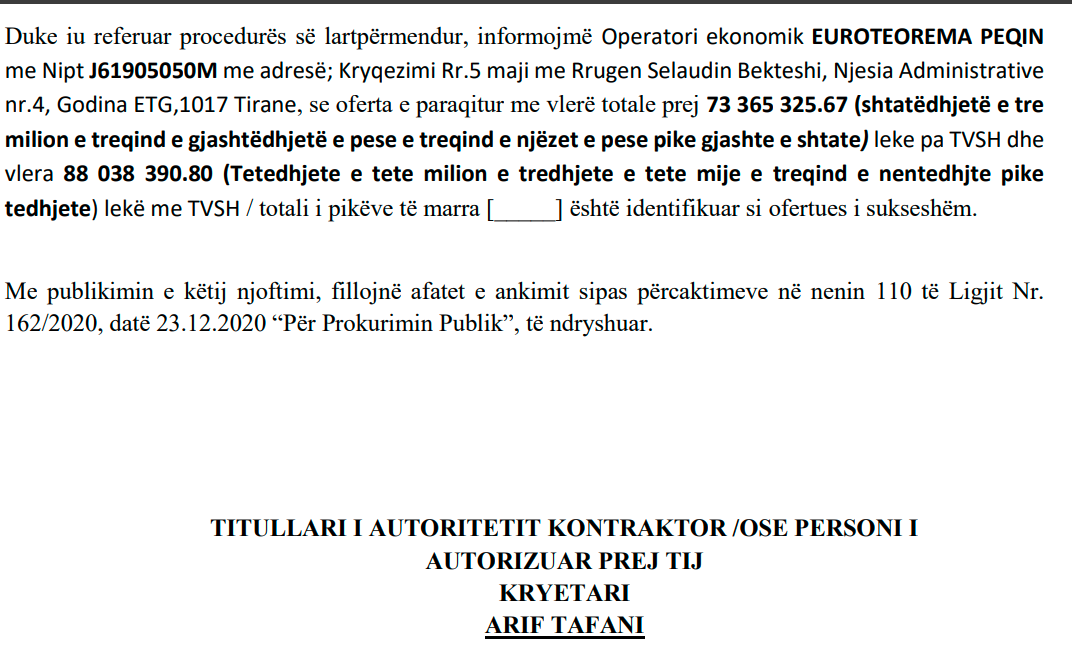 Kompania e Giovanni Pascale e kishte ofertën 73 365 325.67 leke pa TVSH. Po kjo nuk ishte vlera më e ulët e ofruar, sepse kishte kompani të tjera që kishin propozime më ekonomike.