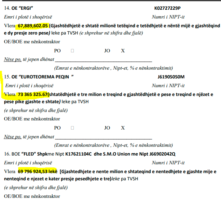 Ndërkaq, kompania “2 N” shpk kishte ofertë akoma më të ulët, 65,692,648 lekë pa TVSH. Në këtë nivel është edhe oferta e kompanisë “ERGI” shpk me vlerë 67,889,602.05 lekë pa TVSH. Edhe propozimi i bashkimit të firmave “FLED” Shpk & “S.M.O Union” shpk me vlerë 69 796 924,53 lekë pa TVSH është më i leverdishëm se sa kompania italiane.
