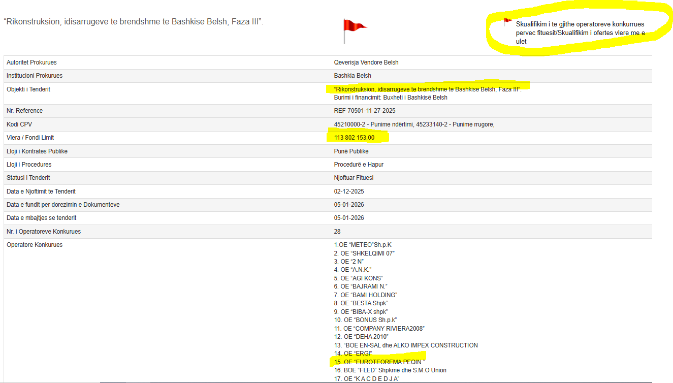 Më konkretisht, bëhet fjalë për tenderin e Bashkisë Belsh me objekt “Rikonstruksion, i disa rrugëve të brendshme të Bashkisë Belsh, Faza III”. Prokurimi i financuar nga buxheti i bashkisë është çelur më 2 dhjetor 2025 dhe është mbajtur më 5 janar 2026.