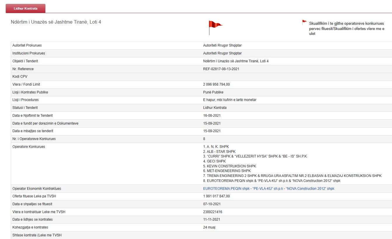 “Skualifikim i të gjithë operatorëve konkurrues perveç fituesit/ Skualifikim i ofertës me vlerë më të ulët”, kështu e përshkruan tenderin Open Data Albania. Për të treguar riskun e korrupsionit, procedura është shënuar me “Flamur të kuq”.