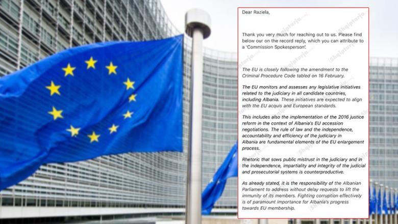 “BE-ja monitoron dhe vlerëson çdo nismë legjislative që lidhet me gjyqësorin në të gjitha vendet kandidate, përfshirë Shqipërinë. Këto nisma pritet të jenë në përputhje me acquis-in e BE-së dhe standardet evropiane”, vë në dukje përgjigja duke bërë të qartë se, nisma e fundit e shumicës, që mban vulën e kryeministrit Edi Rama, nuk është konsultuar më parë më Brukselin.
