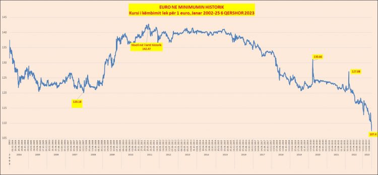 Sipas kursit zyrtar të Bankës së Shqipërisë, monedha europiane u këmbye të martën me 107.4 lekë, duke prekur një minimum të ri historik. Rënia vjetore e euros ka arritur gjithashtu një nivel rekord, prej 10.6%. Vetëm në muajin e fundit, euro ka humbur 3.5% të vlerës në kursin e këmbimit me lekun.