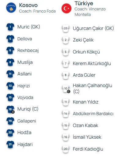 Trajneri Franco Foda i ka besuar 11-shes që hodhi në fushë përballë Sllovakisë, me Muriç në portë, Dellova, Hajrizi dhe Hajdari në mbrojtje, Vojvoda dhe Gallapeni do të luajnë më të avancuar nga krahët, ndërsa në mesfushë janë Hoxha, Rexhbeçaj dhe Muslija. Sulmi do të përbëhet nga dyshja Muriqi-Asllani.