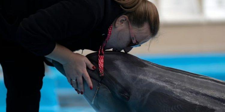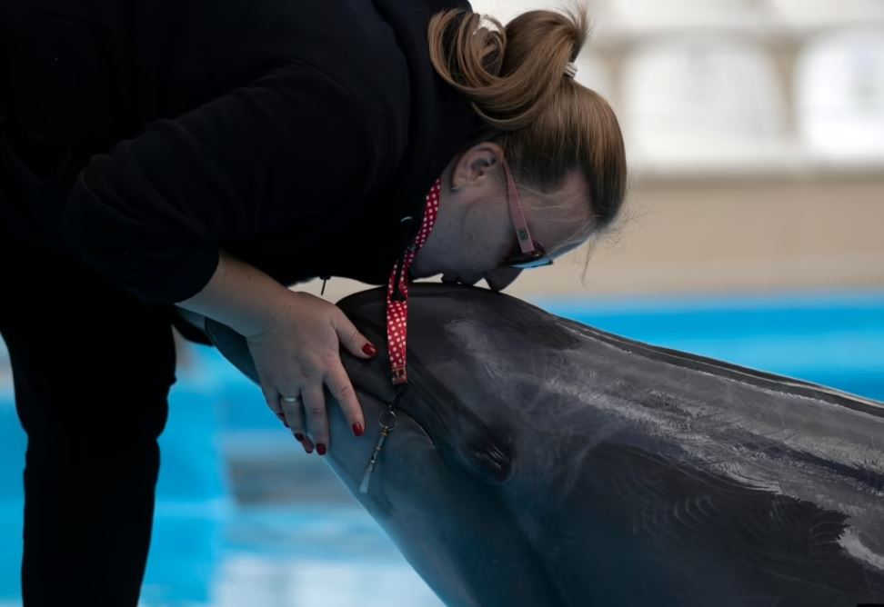 Trajneri Volodyslav Lytnevskiy duke përkëdhelur balenën e quajtur Plombieres. Për shkak të madhësisë së tyre, dy balena të llojit beluga, nuk kanë mundur të evakuohen nga parku në Ukrainë.