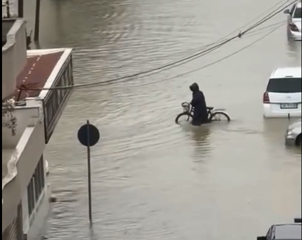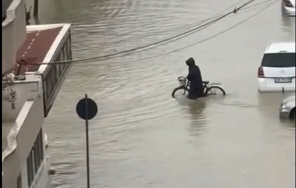 Në videon e shpërndarë në rrjetet sociale, shihen rrugë tërësisht të mbuluara nga uji, automjete të bllokuara dhe qytetarë të detyruar të lëvizin në kushte të vështira.