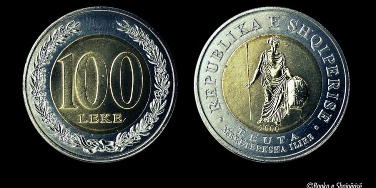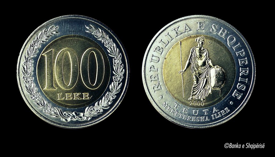 E vetmja ndër monedhat dhe kartëmonedhat shqiptare me kurs ligjor, e cila përfaqësohet me një grua, është monedha me prerje 100 Lekë. Në pjesën e përparme të saj paraqitet Mbretëresha ilire Teuta, shoqëruar me mbishkrimin “Republika e Shqipërisë” dhe vitin e shtypjes të monedhës, 2000.