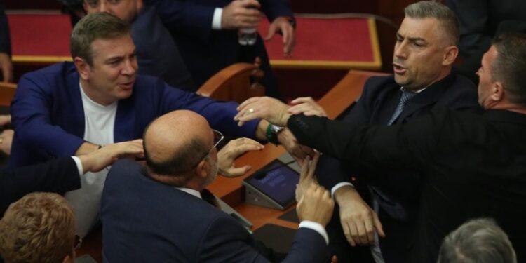 Teksa Sinaj po fliste nga vendi i tij, deputetët e opozitës po protestonin në Kuvend dhe i kërkonin Sinajt të ndërpriste fjalën. Në këtë moment i shkoi pranë Nallbati i cili i fikur mikrofonin. Më pas dy deputetët u shtynë teksa Nallbati tentoi t’i gjuante në grusht atij.