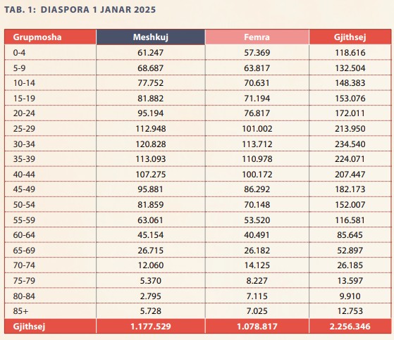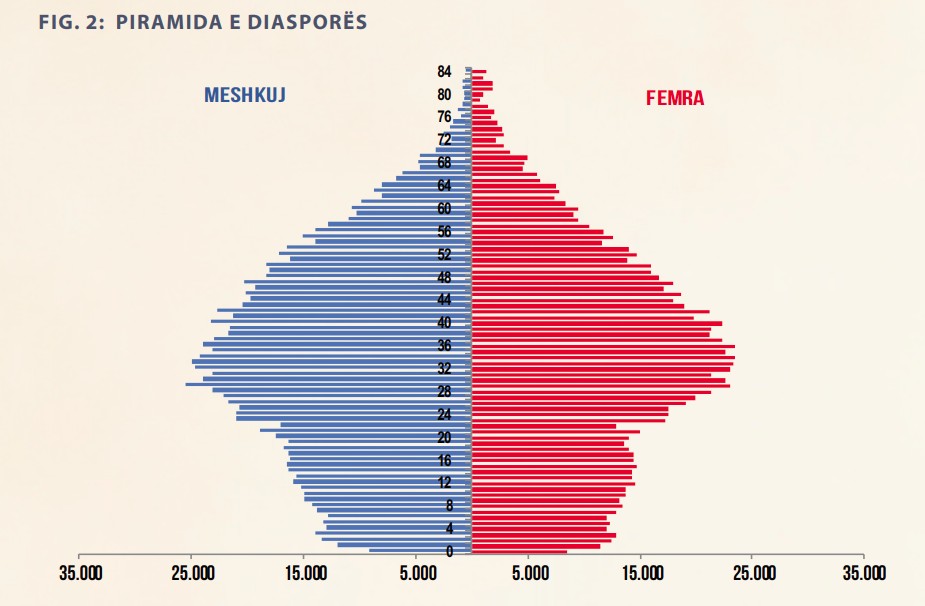 INSTAT thekson se, për shkak të mungesës së regjistrimeve të rregullta administrative për largimet nga vendi, diaspora nuk mund të përllogaritet me saktësi absolute. Për këtë arsye përdoren metoda të tërthorta, duke krahasuar të dhënat e regjistrit civil me popullsinë banuese në vend. Ky vlerësim tregon se diaspora shqiptare ka një profil relativisht të ri dhe ekonomikisht aktiv, me rreth 77% të saj në grup-moshën 15–64 vjeç, ndërsa vetëm rreth 5% janë mbi 65 vjeç, çka e bën atë një burim të rëndësishëm potencial për tregjet e punës në vendet pritëse.