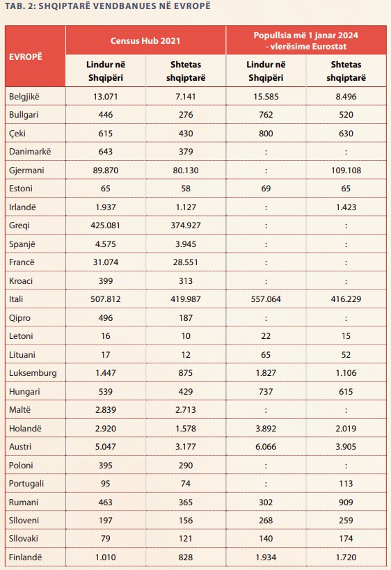 Të dhënat nga censet ndërkombëtare tregojnë se rreth 1.1 milion persona të lindur në Shqipëri jetojnë sot në 31 vende të Evropës, ndërsa rreth 939 mijë shtetas shqiptarë figurojnë si rezidentë në këto vende. Italia dhe Greqia mbeten dy destinacionet kryesore historike dhe aktuale, të ndjekura nga Gjermania, Franca dhe Mbretëria e Bashkuar. Paralelisht, në vitet e fundit është rritur edhe numri i shqiptarëve që fitojnë shtetësinë e vendeve pritëse, veçanërisht në Itali, Greqi, Gjermani dhe Suedi, duke reflektuar një integrim më të qëndrueshëm afatgjatë.