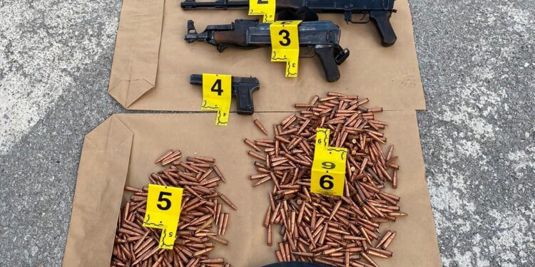 Bëhet fjalë për 3 kallashnikovë, një pistoletë TT, krehra të armëve të zjarrit dhe një sasi municioni luftarak që u gjetën në mjetin e Xhimi Hoxhës dhe Miklovan Veliut, të dy të ndaluar nga policia.