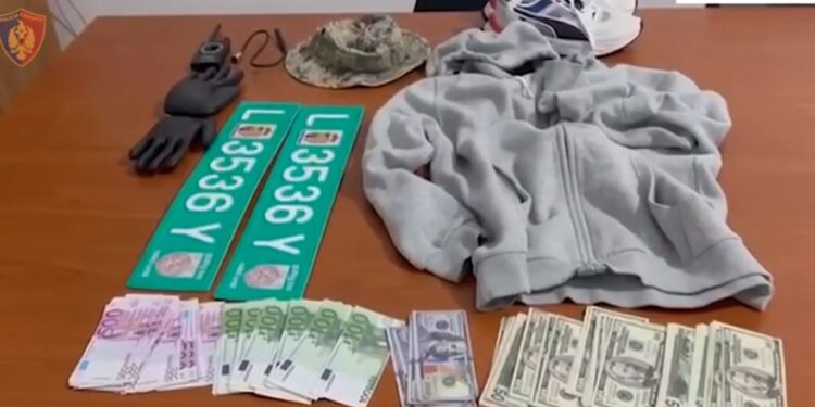 Në banesën e tij, Policia gjeti dhe sekuestroi shuma parash në euro dhe dollarë, të dyshuara të falsifikuara, një dedektor për GPS, një palë targa, automjetin e dyshuar të përdorur në vjedhje, dy celularë dhe veshjet e përdorura gjatë vjedhjes.