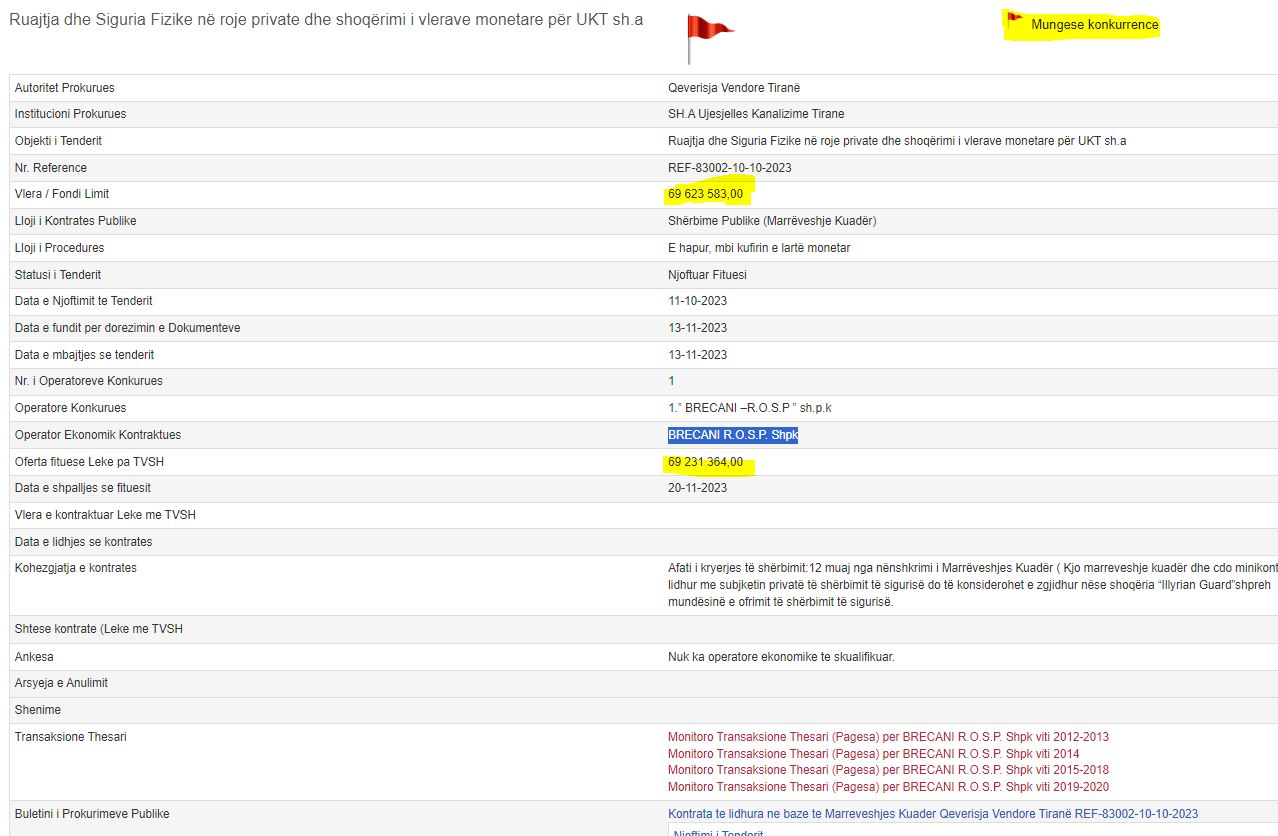 Gara për këtë tender është hapur më datë 11 tetor 2023 dhe afati për paraqitjen e ofertave ka qenë deri më datë 13 tetor. Por, siç shihet në dokument vetëm firma BRECANI R.O.S.P. Shpk ka paraqitur interes. Bëhet fjalë për kompaninë, përfaqësues i së cilës është Erzen Breçani, që këto ditë u arrestua nga SPAK për pjesëmarrje në grupe kriminale dhe korrupsion, pastrim parash, trafik droge dhe favorizim krimi. Me letra, pronar i kompanisë është Fatbardh Brecani, por më media kompaninë e ka prezantuar gjithmonë Erzeni.