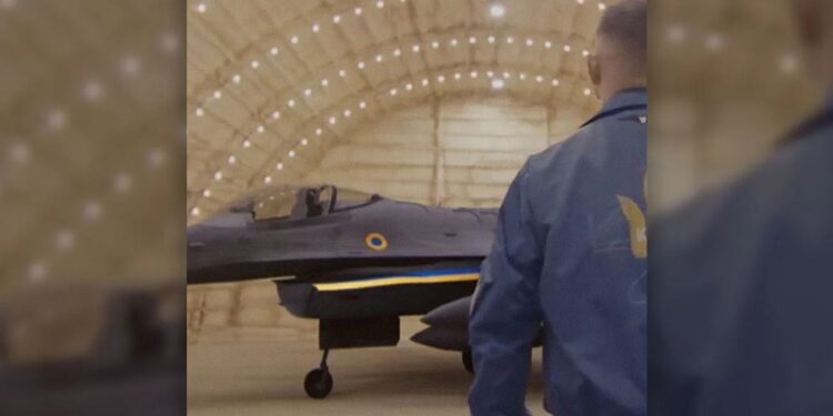 Në video, një burrë me një xhaketë që thotë “Mbretërit e qiellit” hyn në një hangar, i cili ka të ngjarë të jetë nën tokë. Ai ndez dritat dhe shohim që brenda është një F-16 me shenja ukrainase.
