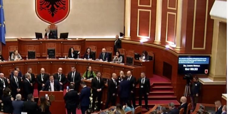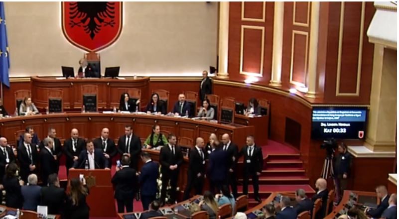 Një kaos i vërtetë në Kuvendin e Shqipërisë. Deputeti i Partisë Demokratike Gazment Bardhi u ngrit nga vendi dhe shkoi pranë ministreve.