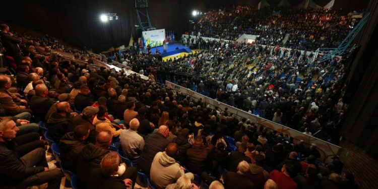 Pallati i Sportit i qytetit është mbushur plot. Ndërkohë shumë njerëz janë edhe jashtë godinës.