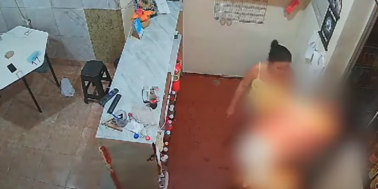 Në pamjet e publikuara, gruaja i afrohet burrit të saj i cili ishte ulur. Gruaja mban në dorë një shishe me lëng të djegshëm, me të cilin spërkat burrin e saj.