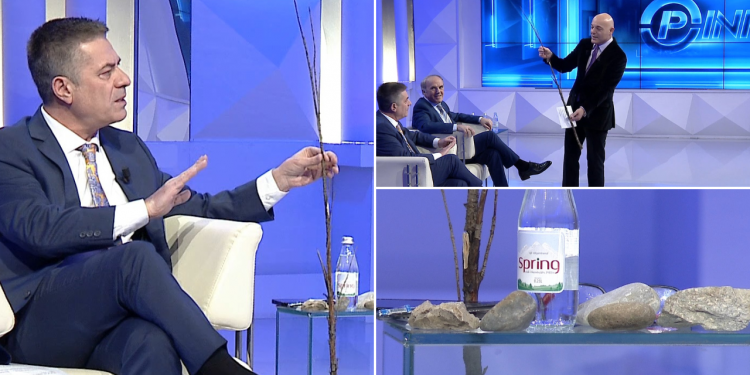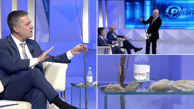 Analisti Lorenc Vangjeli është paraqitur në emisionin “Opinion” mbrëmjen e së mërkurës i “armatosur” me gurë dhe një thupër në dorë.