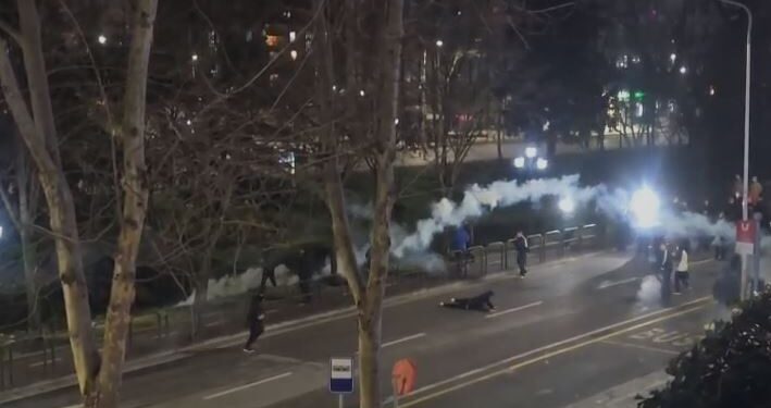 Pranë Parlamentit dhe Xhamisë së Namazgjasë vijon të hidhet molotovë e gaz lotsjellës.