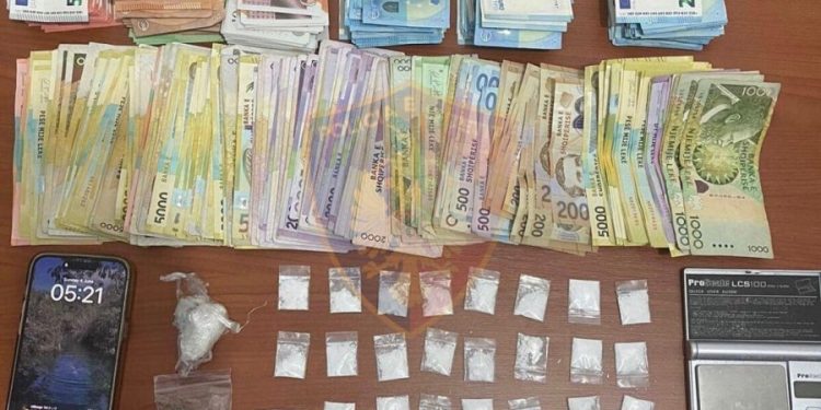 Policia arrestoi shtetasit S. R., 27 vjeç dhe R. D., të cilëve u ka sekuestruar doza të lëndëve narkotike kokainë, kanabis dhe ekstazi, gati për shitje, shuma parash në lekë, euro dhe paund si dhe 2 peshore elektronike.