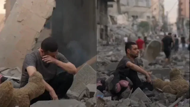 Një burrë palestinez nuk mund t’i mbante lotët e tij teksa qëndronte ulur në rrënojat e shtëpisë dhe dyqanit të tij që u shkatërruan nga sulmet ajrore izraelite në Rripin e Gazës.