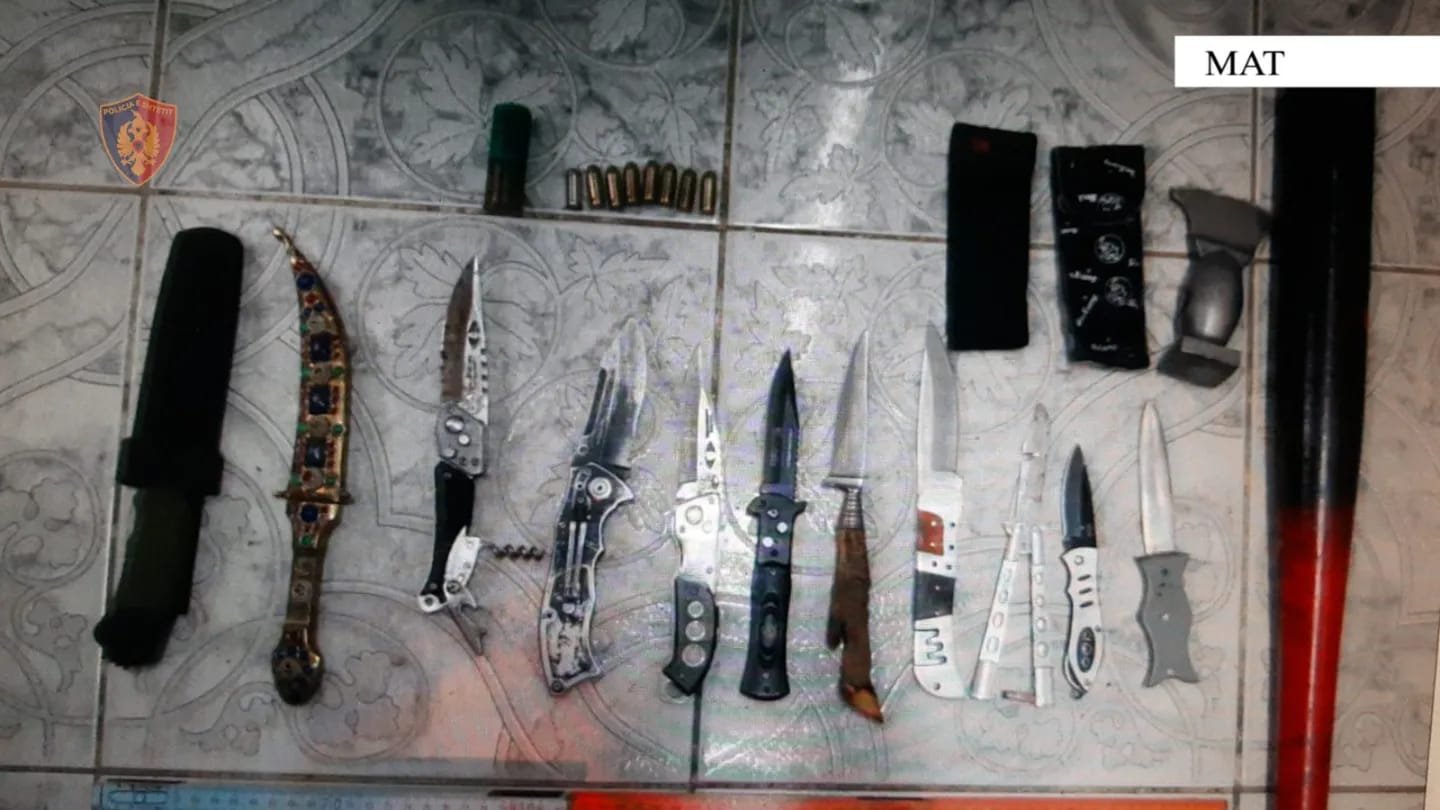 Si rezultat i kontrollit në banesën e shtetasit E.T., shërbimet e Policisë, gjetën të fshehura dhe sekuestruan në cilësinë e provës materiale 11 thika të përmasave të ndryshme, municion luftarak dhe një shkop bejzbolli.
