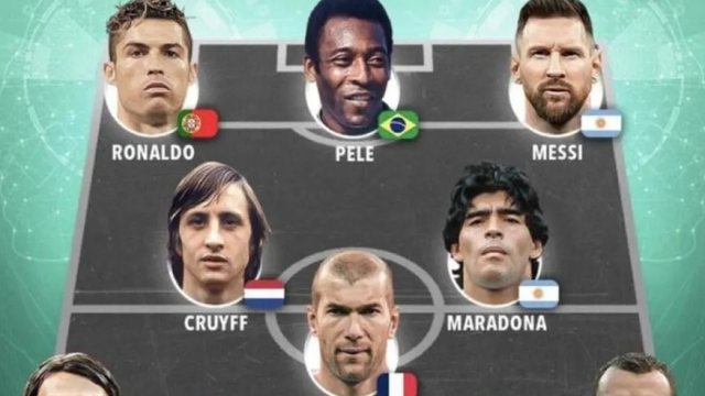 Tre “mesfushorët” janë Johan Cruyff, Zinedine Zidane dhe Diego Armando Maradona, ndërsa në sulm në të dyja anët e Peles janë Lionel Messi dhe Cristiano Ronaldo.