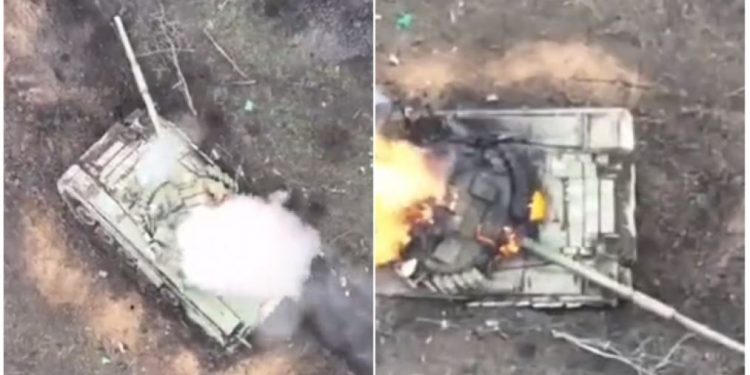 Forcat ukrainase kanë shkatërruar një tank rus të tipit T-80 duke e goditur prej dronit me një predhë.