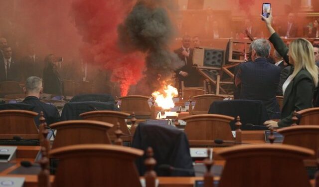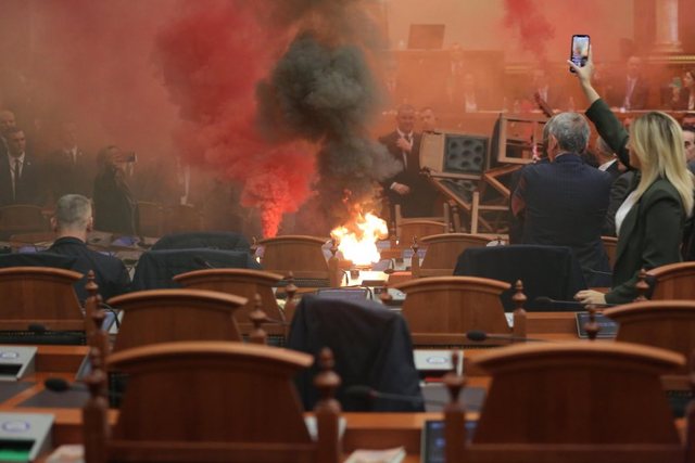 Në një sallë të mbushur me gardistë që kishin rrethuar foltoren e Kuvendit, por edhe pjesën e vendeve të deputetëve të opozitës, duke u kthyer në barrikada njerëzore mes tyre dhe kolegëve të mazhorancës, dhe tymueset që u aktivizuan nga ligjvënës opozitar, Lindita Nikolla, Kryeparlamentare, vendosi të hedhë në votim në parim projekt-buxhetin dhe të mbyllë seancën plenare në më pak se 5 minuta.