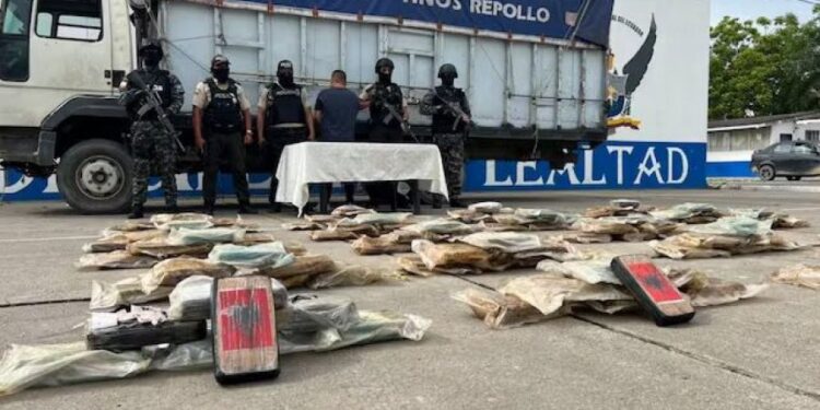 Në një operacion policor në kantonin El Guabo të provincës El Oro në Ekuador janë sekuestruar 122 blloqe kokaine, disa prej tyre me emblemën e flamurit shqiptar. Jonathan M., 37 vjeç, u arrestua pasi transportonte drogën me një kamion.