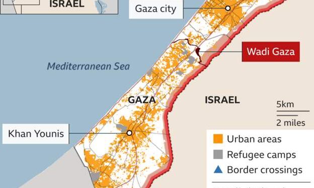 Zona e Rripit të Gazës ku Izraeli ka urdhëruar një evakuim brenda 24 orëve mbulon rreth një të tretën e territorit – në veri të një rrjedhe lumi sezonal të njohur si Wadi Gaza, i cili kalon përmes një brezi të ngushtë toke kryesisht bujqësore.