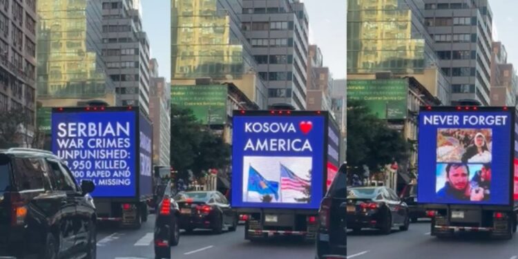 “Kosova dhe Amerika, kurrë mos harro. Rezoluta 2467 e OKB-së e mban Serbinë përgjegjëse për krimet e luftës”, shihet mesazhi që shfaqet në ekranin e vendosur në kamion.