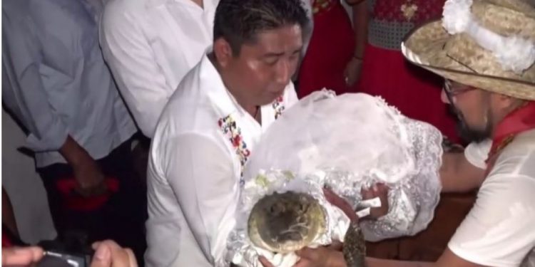 Një kryebashkiak i një qyteti të vogël meksikan është martuar me një krokodil në një ritual të vjetër “për prosperitet”.