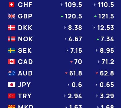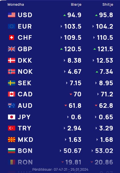Monedha evropiane euro do blihet me 103.5 lekë dhe do shitet me 104.2 lekë, ndërsa franga zvicerane do blihet me 109.5 lekë dhe do shitet me 110.5 lekë.