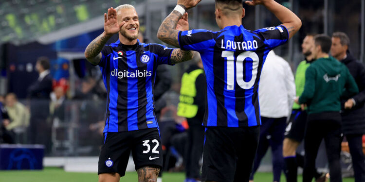 MILAN, ITALY – APRIL 19: Lautaro Martinez (R) of FC Internazionale celebrates with Federico Dimarco (L) after scoring the his team’s secon goal during the UEFA Champions League quarterfinal second leg match between FC Internazionale and SL Benfica at San Siro Stadium on April 19, 2023 in Milan, Italy. (Photo by Giuseppe Cottini/Getty Images)