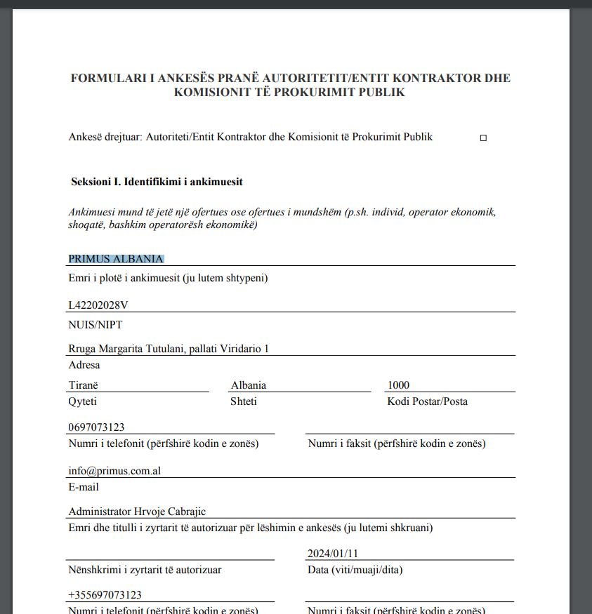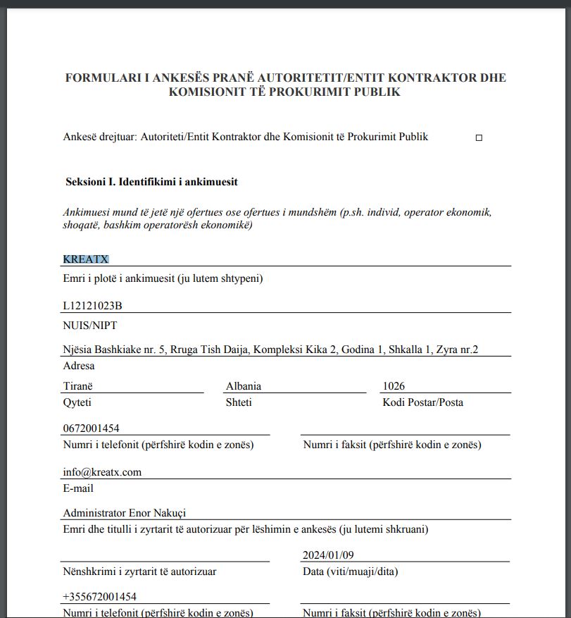 “Pasi kemi analizuar me kujdes Dokumentet Standarde të Tenderit dhe kritereve të përcaktuara në njoftimin përkatës, shoqëria Kreatx sh.p.k , ka konstatuar qe DST ka kritere te vendosura nga AK ne shkelje te hapur te Ligji nr. 162/2020 Për prokurimin publik dhe VKM Nr. 285, dat 19.5.2021. Për Miratimin E Rregullave të Prokurimit Publik, duke ulur gjithë përfshirjen e operatoreve ekonomike dhe për rrjedhoje duke zvogëluar konkurrencën dhe eficencen e procedurës se prokurimit.. Për këtë arsye ne po ju drejtohemi me këtë ankese njëkohësisht SH.A Ujësjellës Kanalizime Tirane dhe Komisionit te Prokurimit Publik ne respektimi te gjitha afateve ligjore te përcaktuara nga ligjet”, thekson ankimuesi.