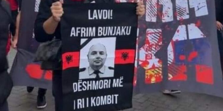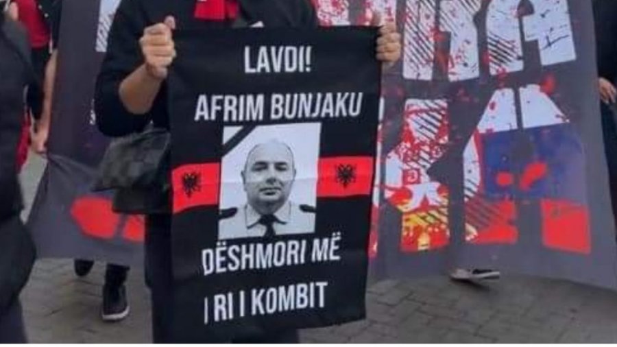 ‘Lavdi Afrim Bunjaku! Dëshmori më i ri i kombit’, shkruhet në pankartë.