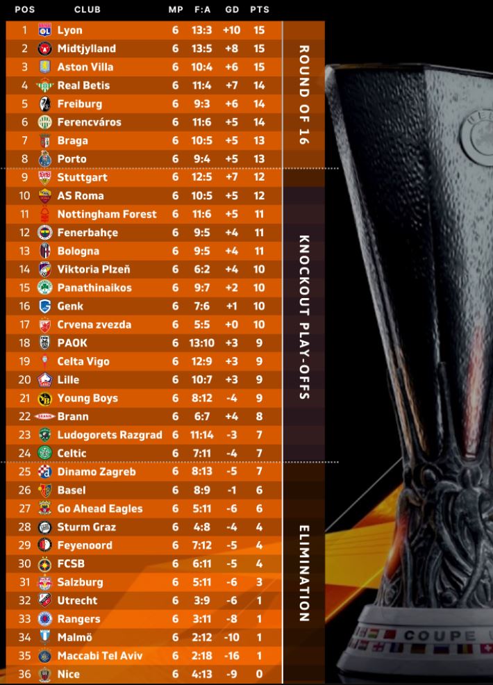 Olimpik Lioni ka fituar 2-1 përballë G. A. Eagles dhe tashmë është kryesuesi i renditjes, duke iu bashkuar Midtjylland dhe Aston Vilës. Anglezët fituan jo pa vështirësi me shifrat 2-1 në transfertë ndaj Bazelit për të ruajtur pozicionin e tyre.