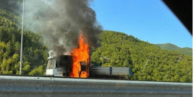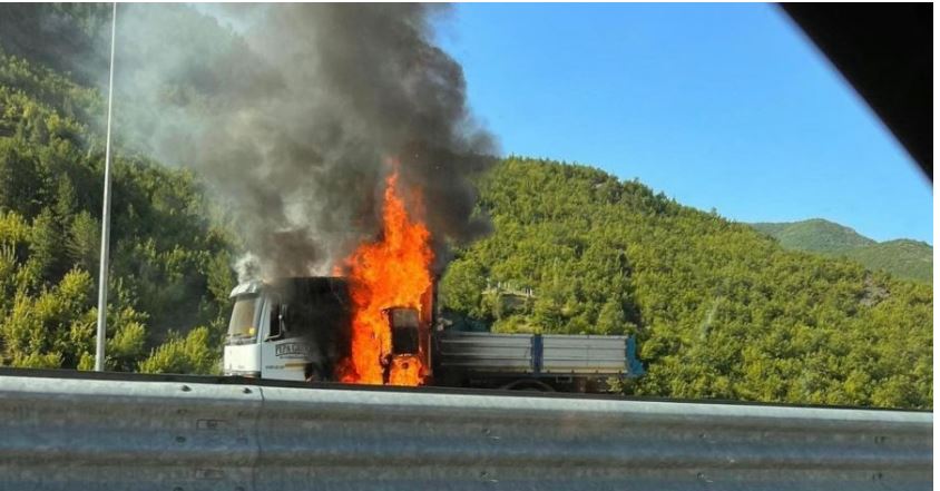 Një kamion ka marrë flakë në ecje, duke u shkrumbuar.