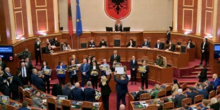 Nën vërshëllimat e bilbileve dhe zhurmuesve, deputetët bllokuan punimet e Kuvendit duke e bërë të pamundur zhvillimin e një seance normale.