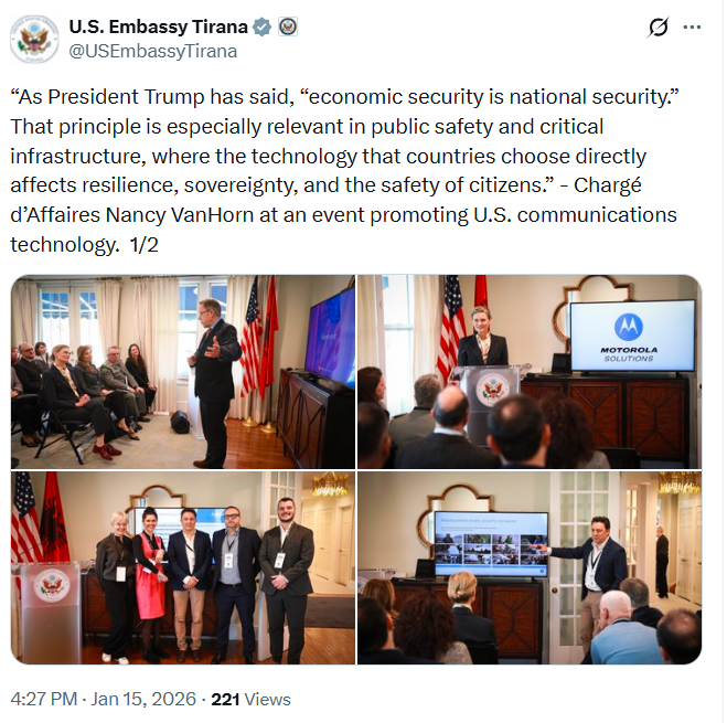 Ambasada e Shteteve të Bashkuara në Tiranë ka rikujtuar rëndësinë e sigurisë ekonomike për sigurinë kombëtare, duke cituar fjalët e presidentit Donald Trump.